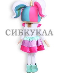 Костюм куклы украшен разноцветными лентами и кружевными элементами, что добавляет образу праздничный и веселый настрой. Волосы куклы закреплены заколками и бантом, что обеспечивает удобство и надежность во время использования.