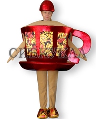 Ростовая кукла "Красная кружка с золотистыми вставками" представляет собой костюм, который надевается поверх тела актера. Костюм выполнен в форме большой кружки красного цвета с золотистыми элементами, такими как ободок, ручки и узоры. Голова актера скрыта под маской, которая также выполнена в виде кружки с лицом, украшенным золотыми деталями.