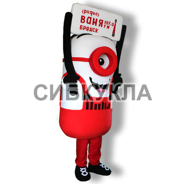 Одна из вариаций миньона. Ростовая кукла была стилизована под фирменный стиль клиента - бело - красно - бордовые оттенки. Миньон держит над головой табличку в фирменной надписью клиента. Табличка эластичная, закреплена на теле куклы