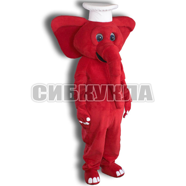Ростовая кукла слон красный выполнена точно так же как и слон розовый. В качестве кроя мы использовали материал велсофт. Голова слона на макушке имеет несъемный поварский колпак белого цвета. Крой колпака выполнен из флиса белого цвета. Каркас головы слона и колпак сделаны из поролона 3-4 см толщиной. Хобот ниспадает значительно ниже линии талии. Также выполнен из поролона. На голове имеется импровизированный рот, более точно его нижняя губа приоткрыта и находится ниже хобота.